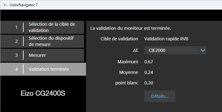 Observation personnelle : J'attire votre attention sur le fait qu'il est rare, à part en haut de gamme, d'avoir de telles valeurs identiques avec mes deux colorimètres. De plus, le passage d'un profil à l'autre montre très peu de variations d'affichage. Seuls les meilleurs écrans le permettent. Cet Eizo CG2400S fait donc partie de la cour des grands !