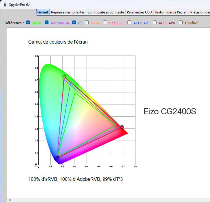 4 - Enfin les gamuts affichés par cet Eizo ColorEdge CG2400S mesurés par mon colorimètre SpyderPro Datacolor :